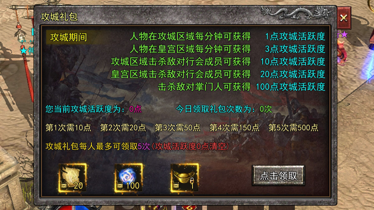 开区第3天上午9:00左右合区,晚上20:00-21:00集体攻城。平时每周二/四/六/日攻城,具体时间可在第一大陆神歌使者旗杆处查看。首次攻城奖励会长300充值点,后续奖励200充值点,21:00-21:30可领取。行会成员参与攻城积攒活跃点,可以领取1到5次攻城礼包。活跃点规则可在第一大陆神歌使者旗杆处的【攻城礼包】查看。