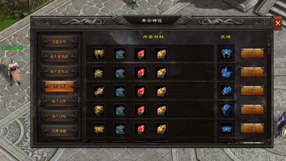 在青云山庄内中心区域(需通过老兵传送)青云神匠NPC处,消耗通云、逆火、狂雷等指定套装,搭配陨铁、红色晶石及矿石,打造各职业专属的倚天首饰套装,包括头盔、项链、手镯等。当穿戴整套倚天首饰后,即可激活大范围恐怖杀伤技能“倚天辟地”,实现战力的飞跃式提升。陨铁可通过打怪掉落获得,红色晶石由分解红色装备产出,矿石则可通过商城购买、任务奖励或挑战世界BOSS掉落获取。