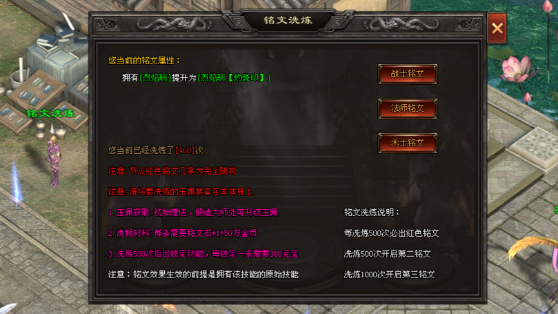 在巫山城(325,354)安全区上方铭文洗炼NPC处,消耗铭文石(打怪掉落)和金币,洗炼本职业玉佩上的铭文技能。铭文分为绿色、黄色和红色3种品质。不同品质的铭文可为技能带来多种变化,比如增强威力、改变外观、扩大范围等效果。累计洗炼500次,必定会获得红色铭文,并且解锁第二铭文槽以及锁定功能。锁定单条铭文需消耗300元宝。当累计洗炼达到1000次时,可开启第三铭文槽,解锁更多技能搭配的可能性。此外,1级玉佩是角色出生时赠送的福利。后期可通过锻造大师NPC升级玉佩,在升级过程中,已解锁的铭文会完整保留,不用担心养成成果会丢失。