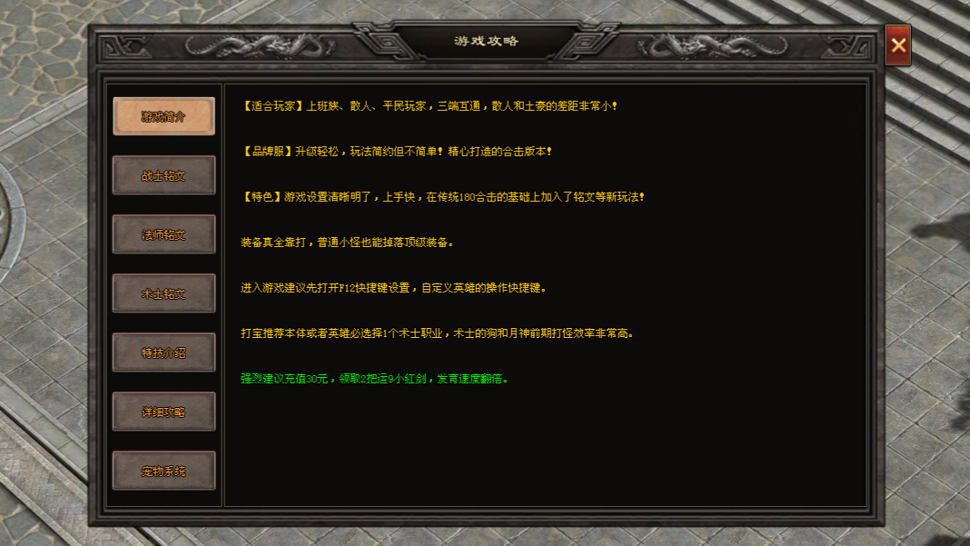 进入游戏后,首先选择适合的英雄组合。新手玩家推荐选择术士+法师组合,因为双召唤宠物的加持能让前期刷怪效率远超其他职业,发育更加稳定。如果有一定的消费能力且熟悉游戏,可以考虑选择战士英雄,战士在后期的PK中优势明显。不过,无论是否消费,选择战士都需要预留时间培养材料装备号,否则前期练级和打BOSS的难度会比较高。