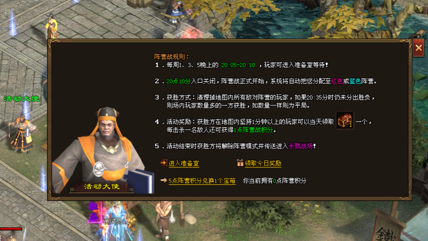 玩法说明:活动开启后,系统自动分配阵营,目标是清空地图内所有敌对阵营玩家。若20:35仍未决出胜负,则根据场内玩家数量多的一方判定获胜;若双方人数相同,则为平局。获胜方中,在地图内坚持满1分钟的玩家,当日可领取阵营宝箱1个。活动结束后,获胜方自动解除阵营模式,并被传送至杀戮战场,该地图将刷新1只超级BOSS,供玩家挑战争夺丰厚奖励(如材料等)。