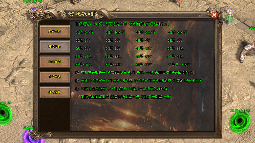 游戏核心亮点涵盖BOSS图鉴、天赋洗炼、品质大师、坐骑注灵、三格觉醒等特色玩法。免费7日礼包、VIP、赞助均可免费获得,另有首杀、首爆、冲级等奖励,活动赠送海量资源。怪物等级越高爆率越高,低级怪也有概率出高级装备,每张地图均有高爆率专属怪物;BOSS分超级、世界、黄金、全爆4类,等级越高掉落越丰厚,超级及以上BOSS可爆全服道具、元宝、材料、充值券。特色BOSS鞭尸系统,击杀超级BOSS有几率鞭尸,击杀全爆BOSS可触发天之BOSS,天之BOSS死亡可触发神之BOSS,天之、神之BOSS爆率分别为2倍、3倍。