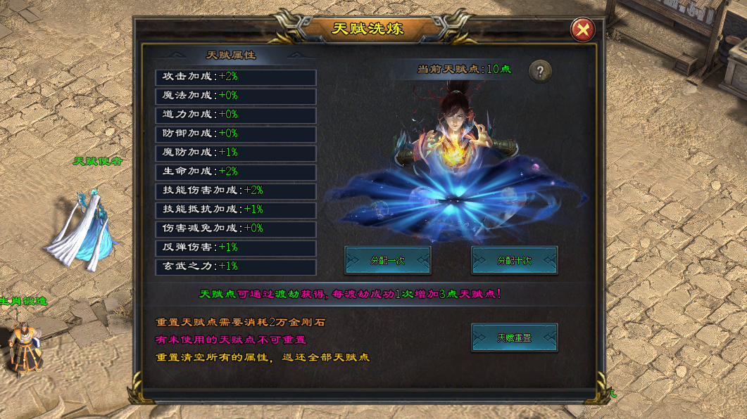 在天涯海角(第二大陆)安全区上方天赋使者NPC处,可分配天赋点洗炼天赋属性。天赋点可通过渡劫获取,每渡劫成功1次可获得3点天赋点。每次分配天赋点会随机获得天赋属性,若对属性不满意,可消耗金刚石重置天赋点后重新分配;分配过程中有几率获得玄武之力+1,当玄武之力累计至10点可解锁专属技能。该技能可凝聚全身经脉之力,让人物变大10秒,同时消除自身负面状态,获得20%伤害减免,每秒额外恢复3%血量,技能冷却时间120秒。
