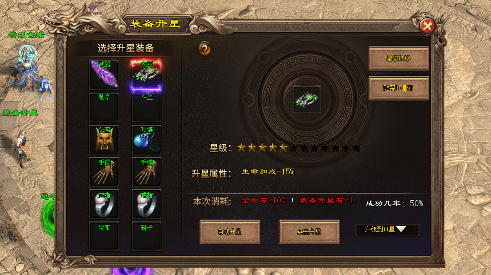 在天涯海角(第二大陆)安全区左侧装备升星NPC处,消耗装备升星石(打怪掉落/NPC处元宝购买)、金刚石提升装备星级,星级越高属性加成越丰厚,最高可升至12星。升星规则为1-4星失败不掉星,4星后成功+1星、失败-2星。后期获得更高级的装备可在NPC处消耗元宝将星级转移,星级转移后原装备不会消失。