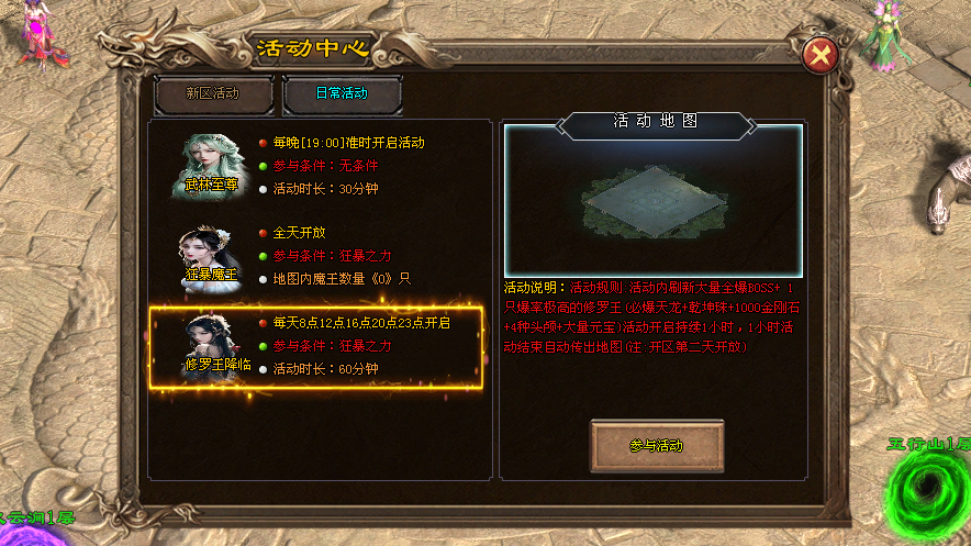 玩法说明:当全服累计开启88个狂暴之力后,活动地图将直接刷新3只狂暴魔王,击杀必爆海量材料、高阶装备及10元充值卡。