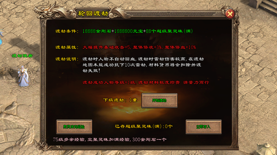 在天涯海角(第二大陆)安全区上方渡劫使者NPC处,消耗金刚石、元宝和超级聚灵珠(满)开启渡劫。渡劫共20重,过程中人物无法自动回血且雷劫伤害较高,需在渡劫地图抗下10次雷劫,若未能完成将扣除消耗的材料与货币且渡劫失败。每次渡劫成功可提升等级1级,还能获得倍攻+10%、生命+40%、攻速+1%的属性加成。超级聚灵珠可在商城购买,75级后多余的人物经验可在NPC处消耗金刚石为超级聚灵珠补充经验,装备回收时也会自动为超级聚灵珠补充经验。