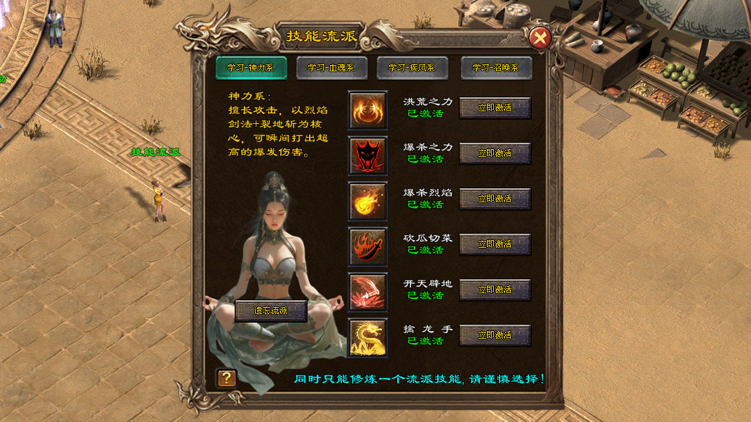 在龙城安全区右侧技能流派NPC处,消耗打怪掉落的BOSS头颅、金刚石,可学习对应等级的流派技能,首个技能可免费激活。技能流派共分4类:神力系专攻强攻、血魂系擅长控场、疾风系高攻速加吸血、召唤系攻防辅一体。同一时间仅能修炼一种流派技能,选择时还请谨慎;若对已选流派不满意,也可消耗金刚石遗忘技能后,重新学习其他流派。